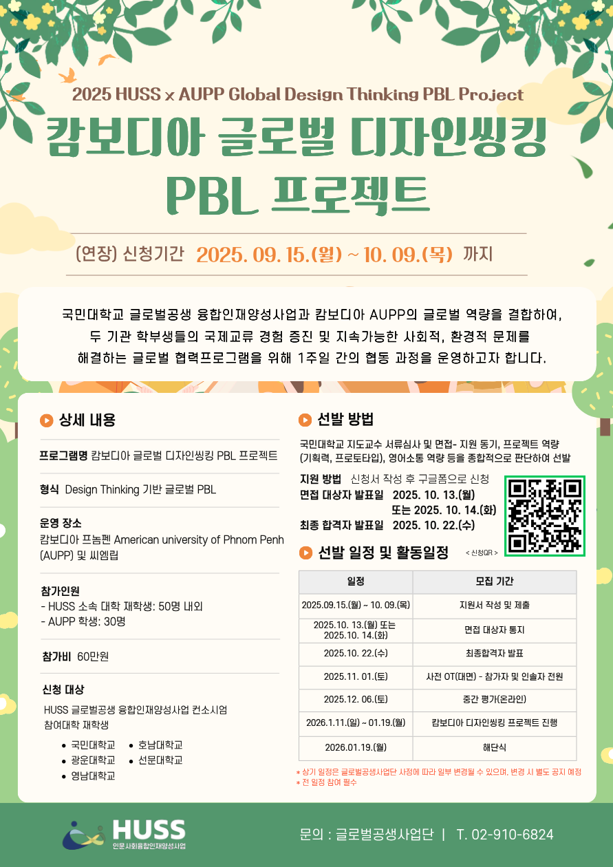 글로벌 공생 인문사회융합인재양성사업단(HUSS)에서 2025 HUSS 캄보디아 글로벌 디자인씽킹 PBL 프로젝트에 참가할 학생을 모집합니다.