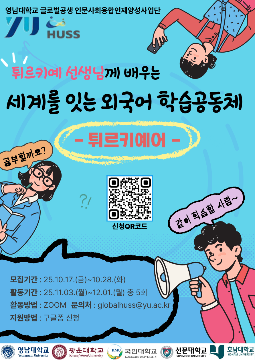 글로벌 공생 인문사회융합인재양성사업단(HUSS)에서 영남대학교 학습공동체 '세계를 잇는 외국어 학습공동체(튀르키예어)' 참가자를 모집합니다.