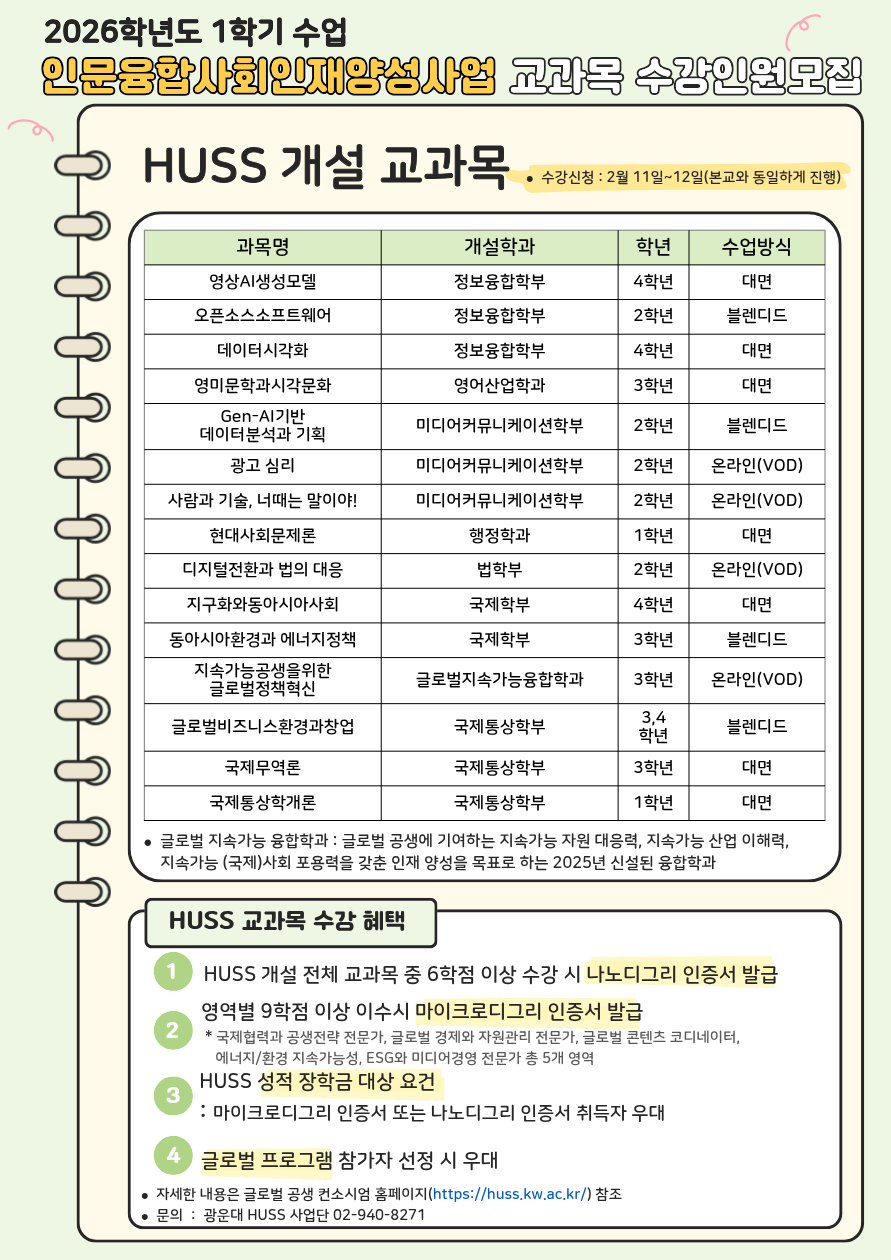 글로벌지속가능융합학과 마이크로디그리별 26년 1학기 개설 교과목 안내